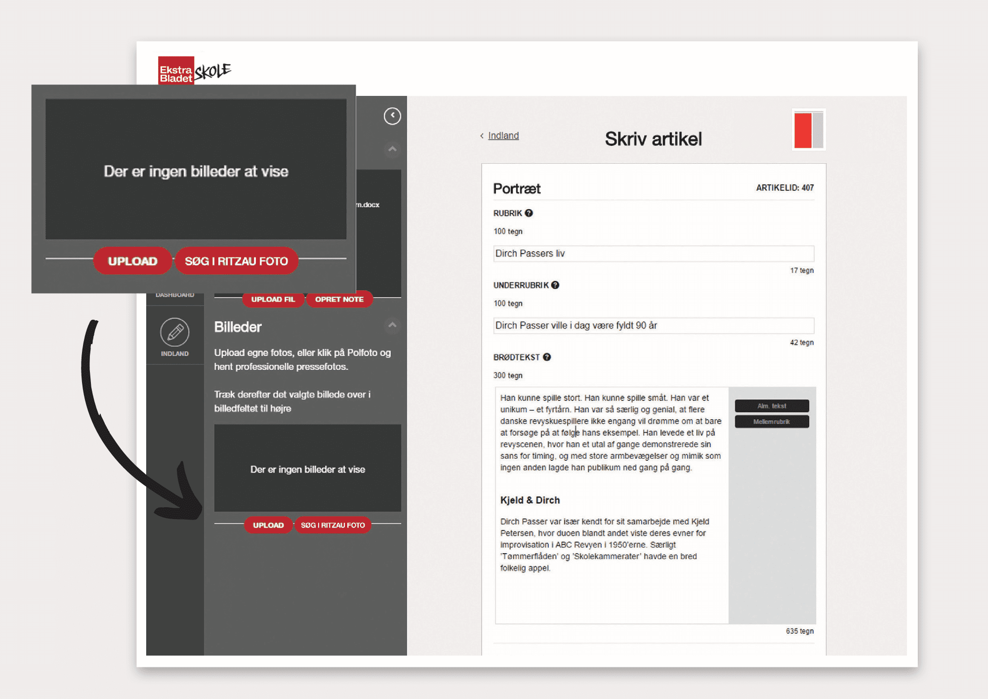Man kan uploade sine egne billeder og illustrationer til Newsdesk, eller man kan vælge at søge i Ritzau Scanpix. Billeder kan både uploades på redaktionens dashboard eller når eleven skriver artiklen. For højest mulig billedkvalitet anbefales det at uploade billeder direkte fra den enhed, som de er taget på. Er billedet for eksempel taget med mobiltelefonen, kan man åbne en browser på mobiltelefonen, logge på Newsdesk og uploade billedet direkte herfra.