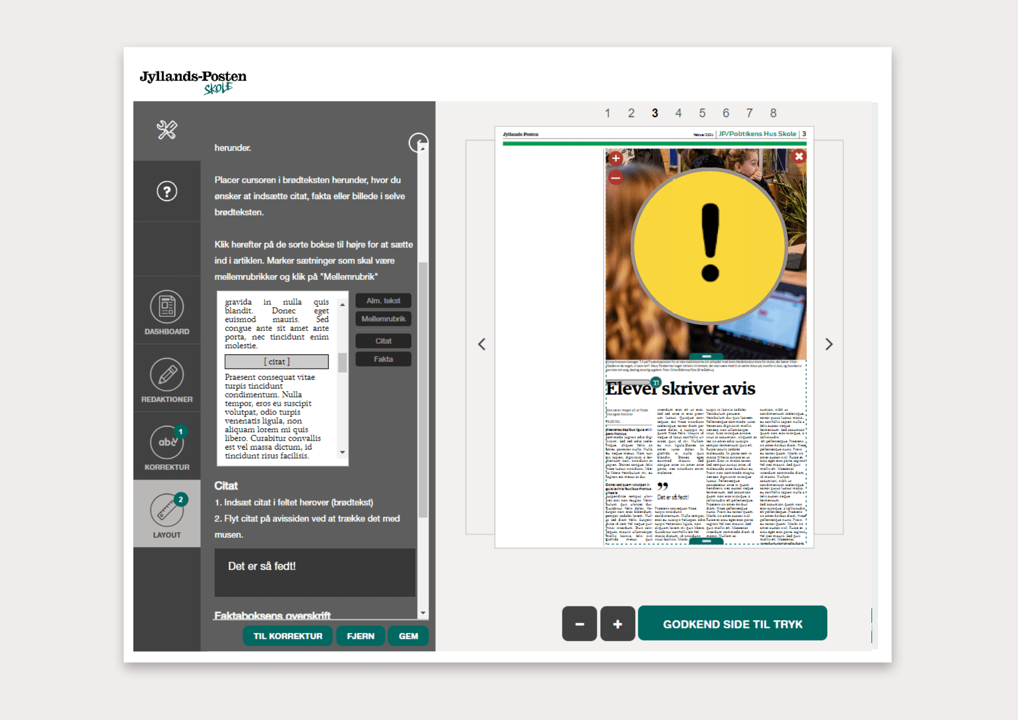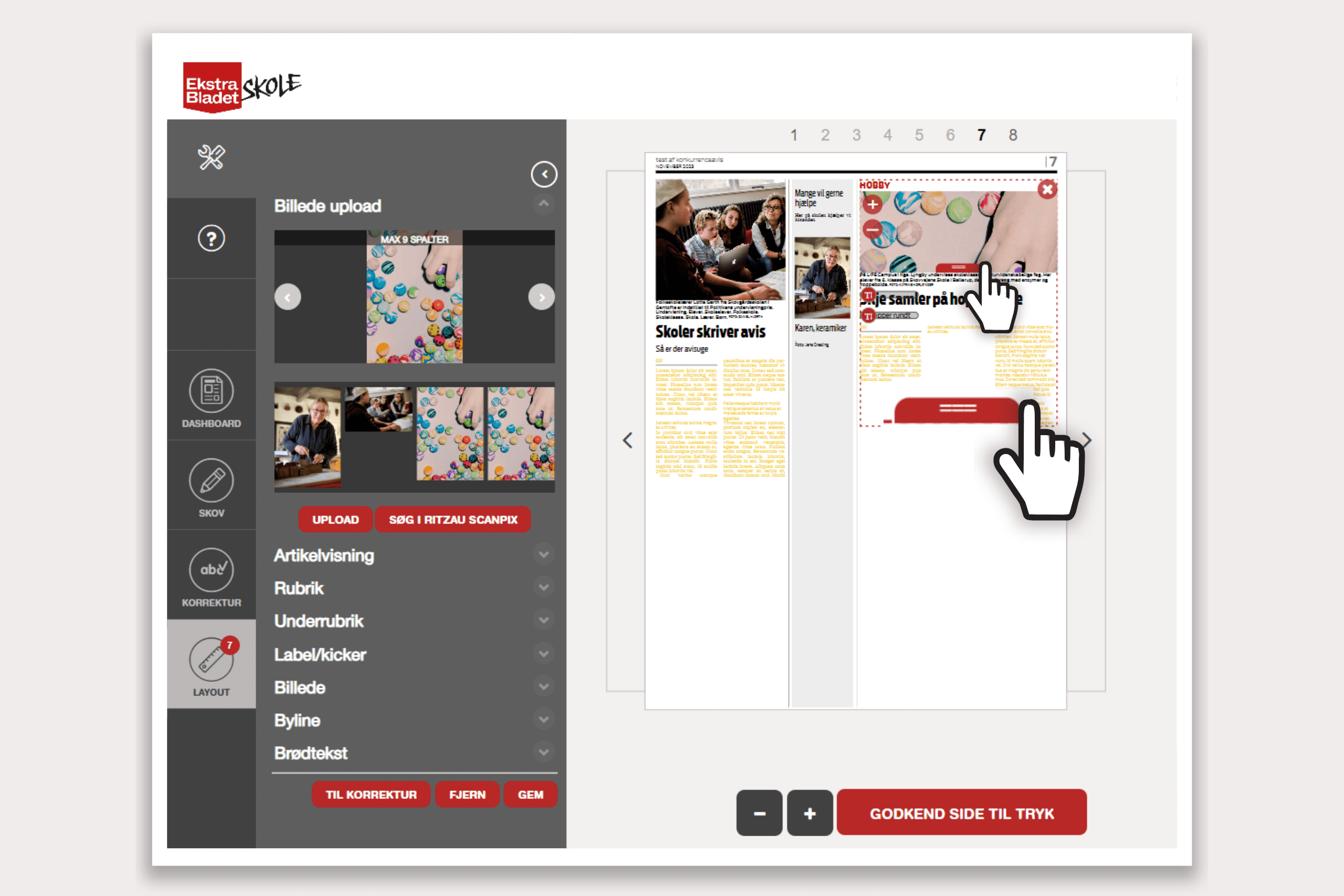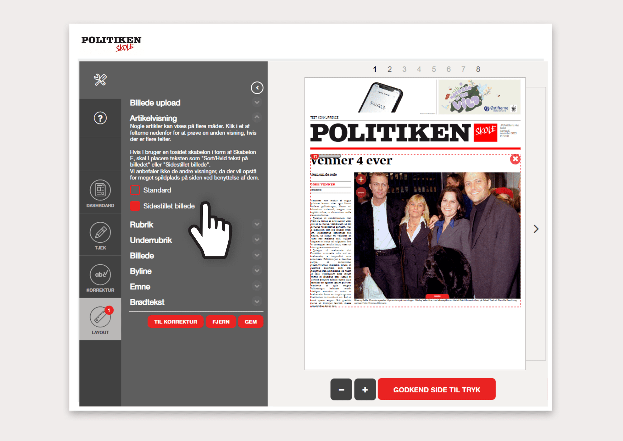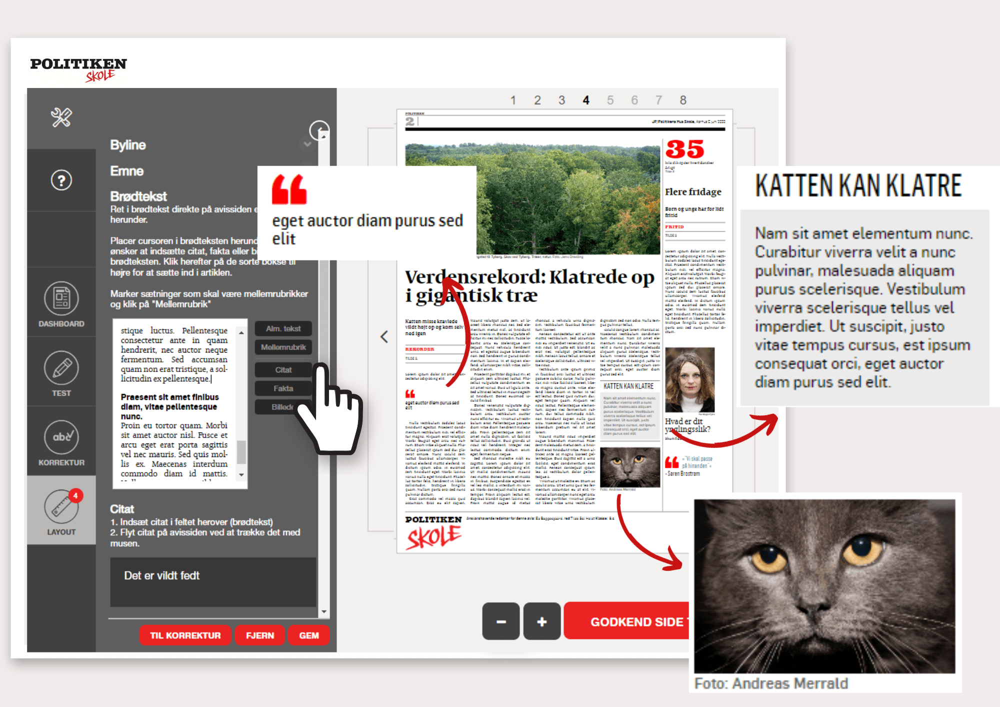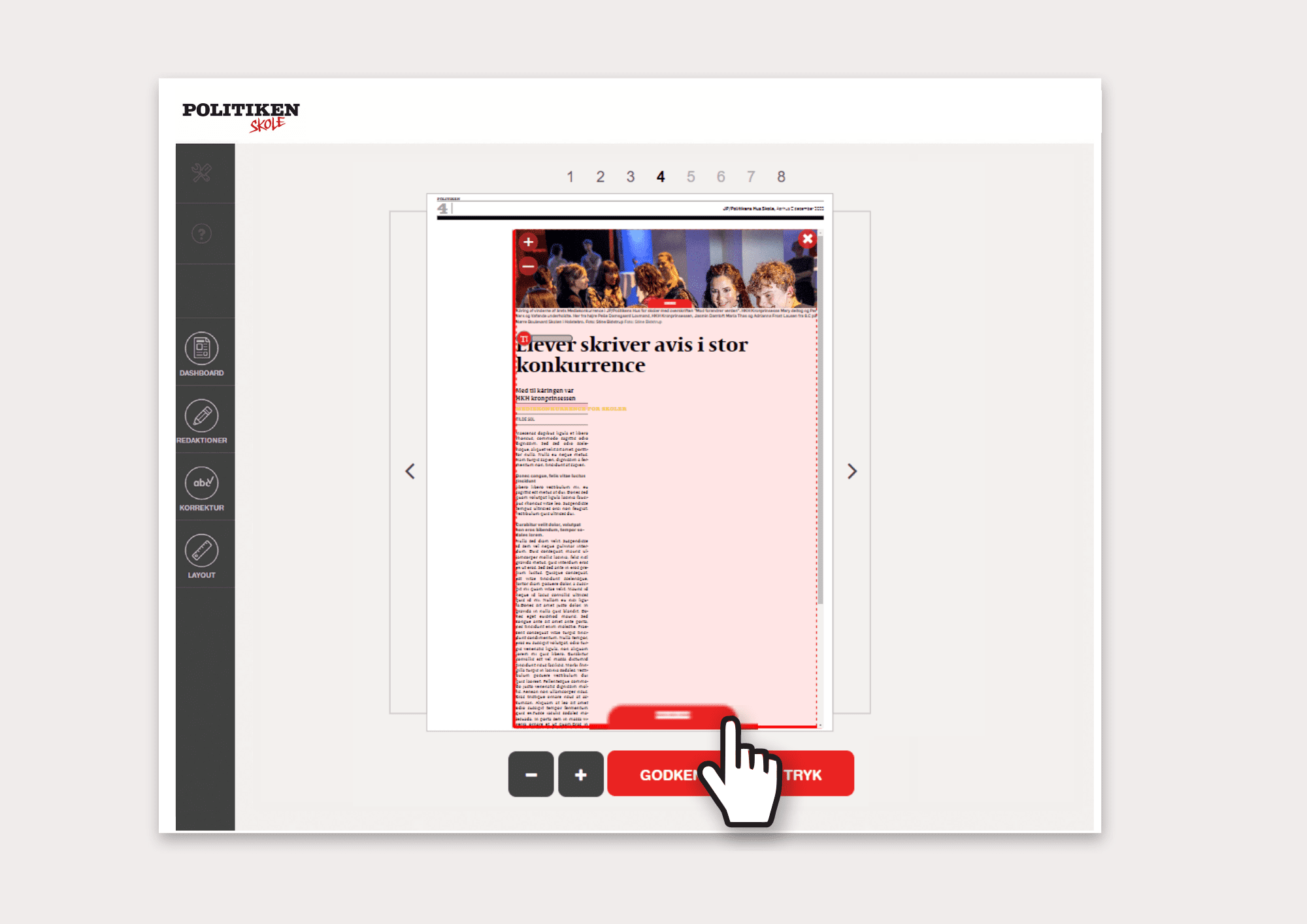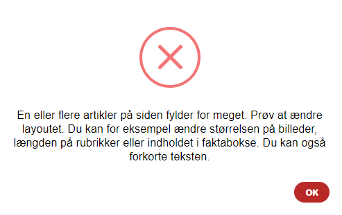 Der er en farvet bjælke i bunden af både tekstfeltet og artikelbilledet. Ved at trække i den, kan du justere det område, artiklen fordeler sig over. På den måde kan du få artiklen til at passe til siden. Hvis teksten er rød, fylder den for meget. Du kan enten se, om du kan justere på billedets størrelse, forkorte rubrik, faktaboks og citater, eller du kan forkorte teksten en smule.