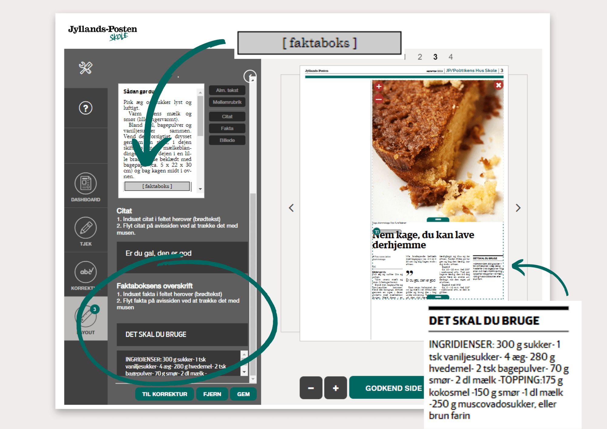 Der kan ikke laves linjeskift i faktabokse, derfor foreslår vi, at teksten enten skrives som hele sætninger eller i én linje som punktopstilling, for eksempel: ”Æg: 3 – Mælk: 2L – Mel: 40g – Gær: 25g”