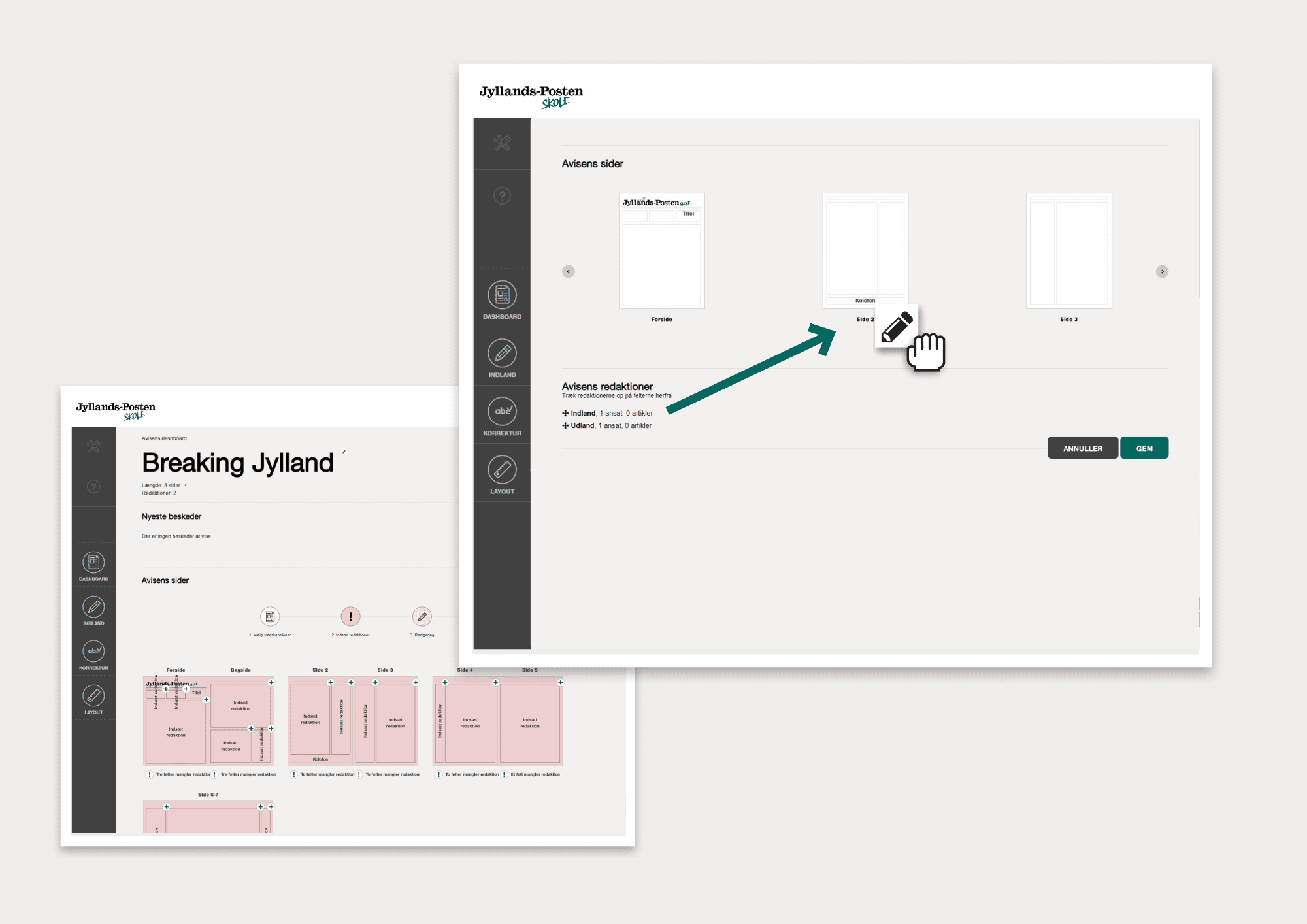 - På redaktions dashboard kan eleverne samle research, uploade billeder og få et overblik over deres artikler og placering i avisen.