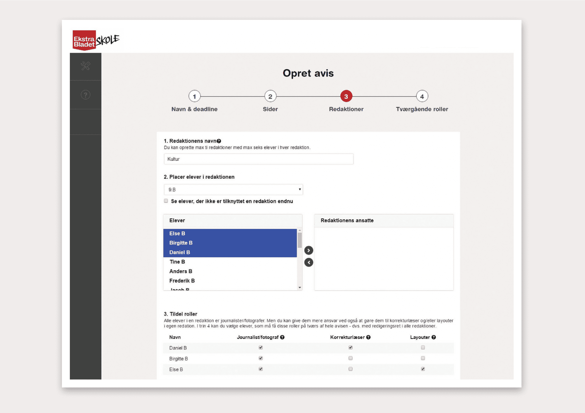 Hvis du ønsker at tildele en gruppe elever ansvar for korrekturlæsning eller layout af avisen på tværs af redaktioner, skal du gøre det i step 4: ‘Tværgående roller’.
